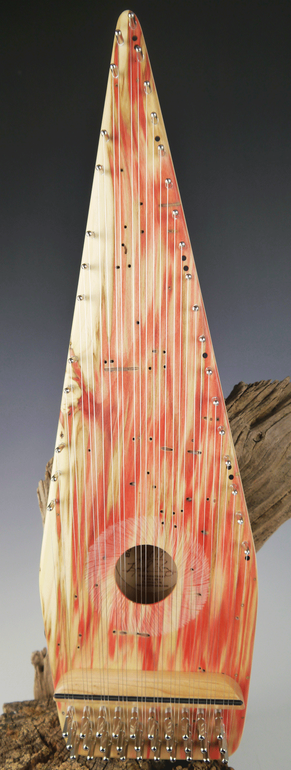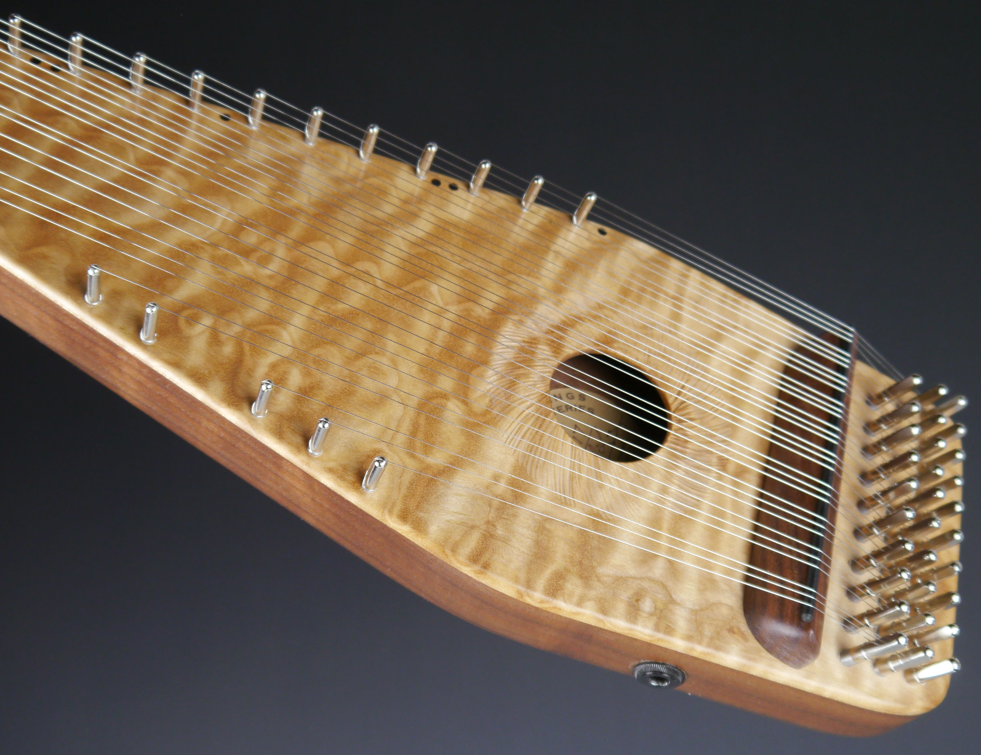 This psaltery has a pickup installed. Great for plugging into an amplifier for volume, but also to take advantage of those great sounding effects. Chorus effect sounds epecially nice when used with the bowed psaltery.